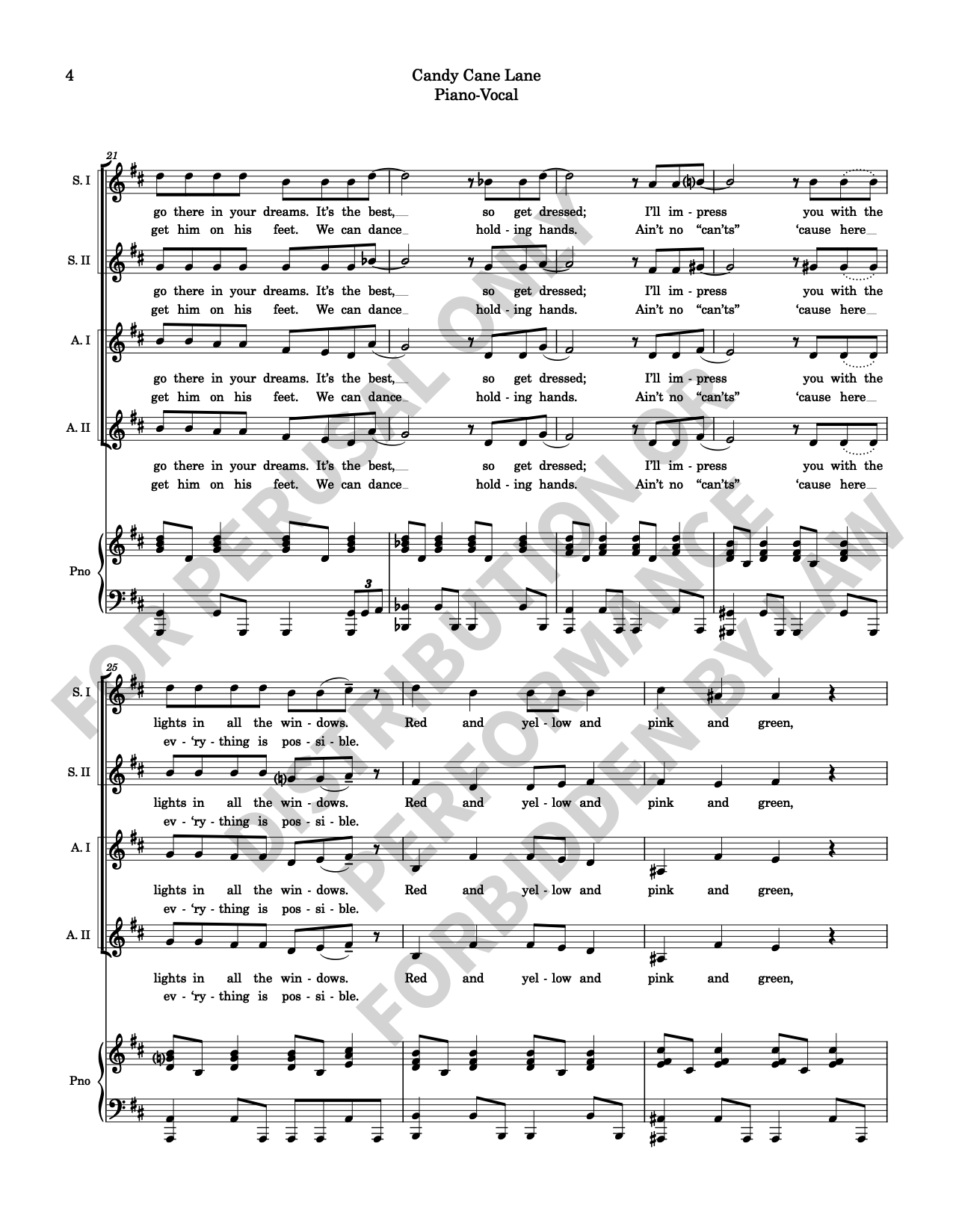 From Australian singer-songwriter Sia's album, Everyday Is Christmas bounces this infectiously cheery confection, arranged here for SSAA chorus. This is one of those holiday numbers that's readily singable, great fun to perform, and unforgettable for your audiences. Take a trip down Candy Cane Lane!