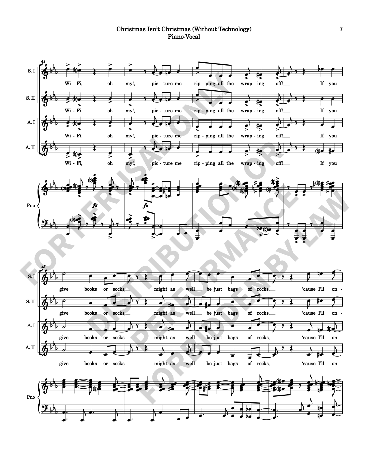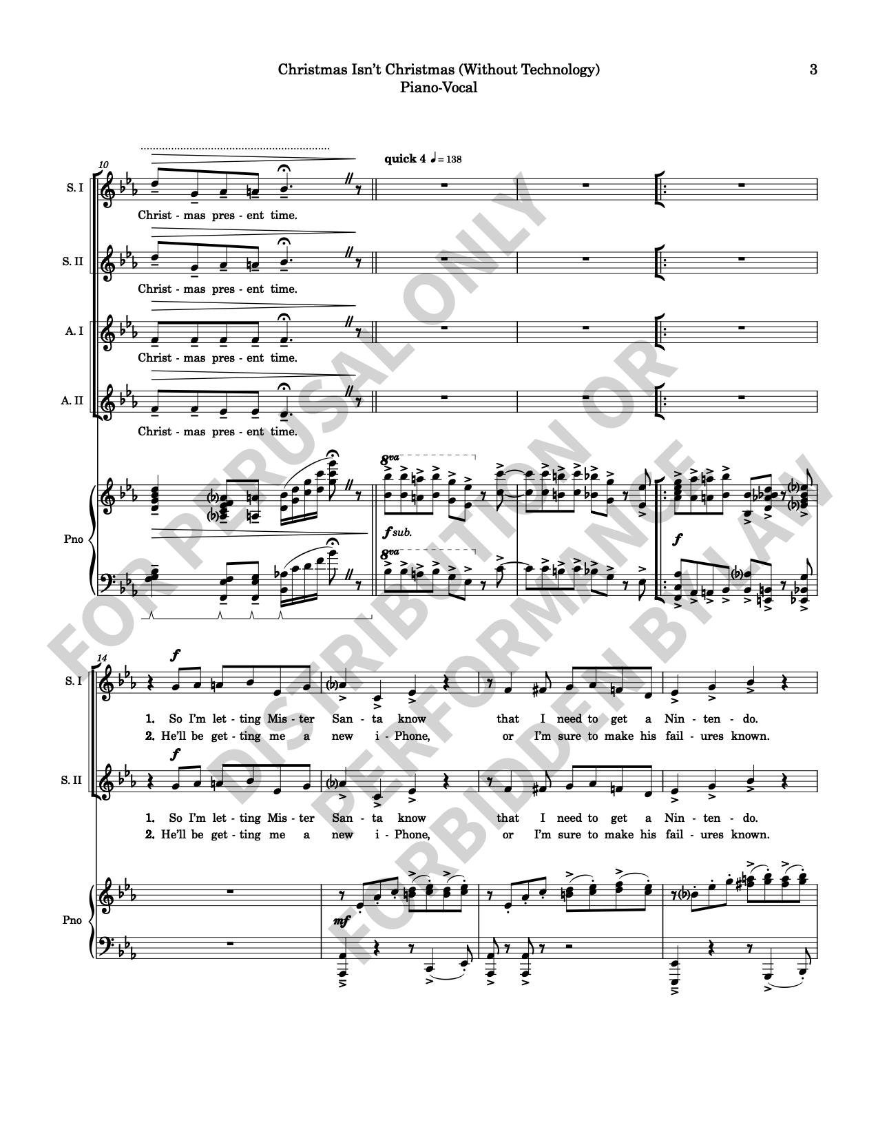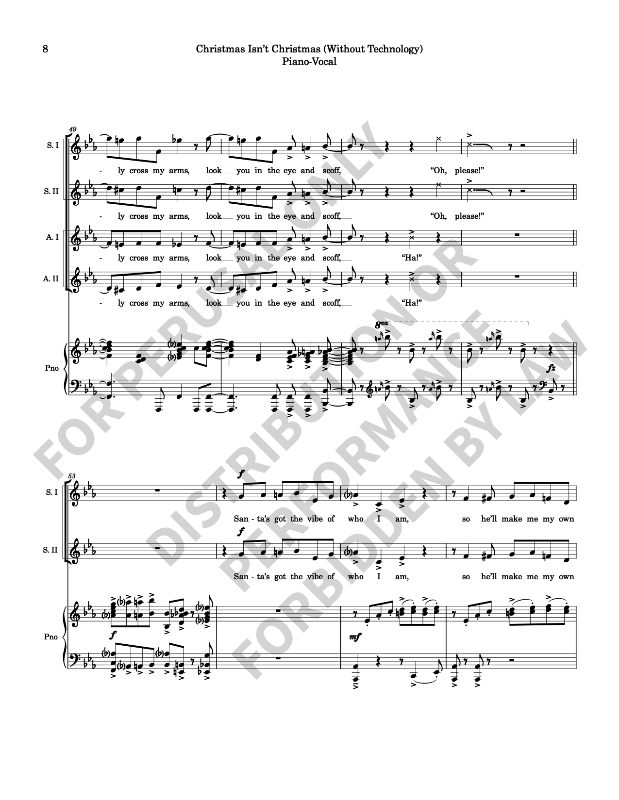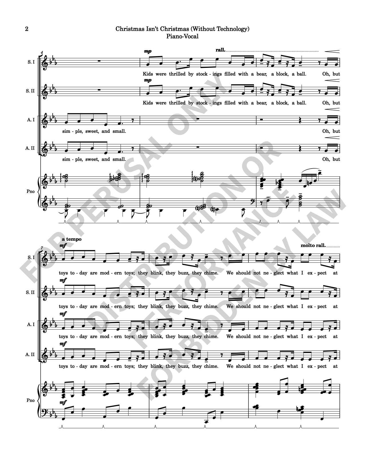 Decades ago, youngsters were happy with simple toys and gifts at holiday time. But these days, if it doesn't light up, access WiFi, buzz, or twinkle, they don't want it! This humorous SSAA theatre-pop number is sung from the viewpoint of the kid who knows exactly what Santa needs to deliver! A fun "character" piece your chorus will cackle over!