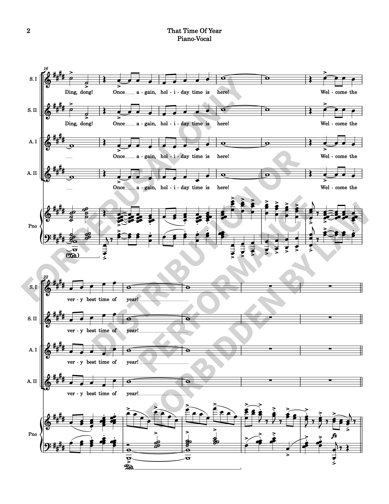 Sparkling and buoyant, this non-religious holiday concert opener emulates the feel of festive Hollywood fanfares and seasonal treats. Primarily 2-part, occasionally dividing to 4, this piece is singable, accessible, and a rousing anthem for SSAA chorus.