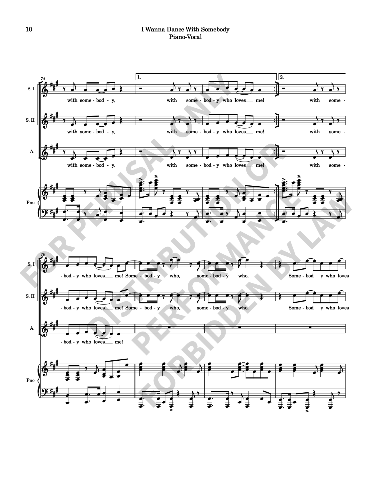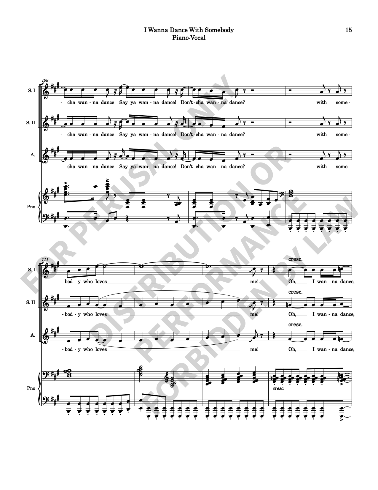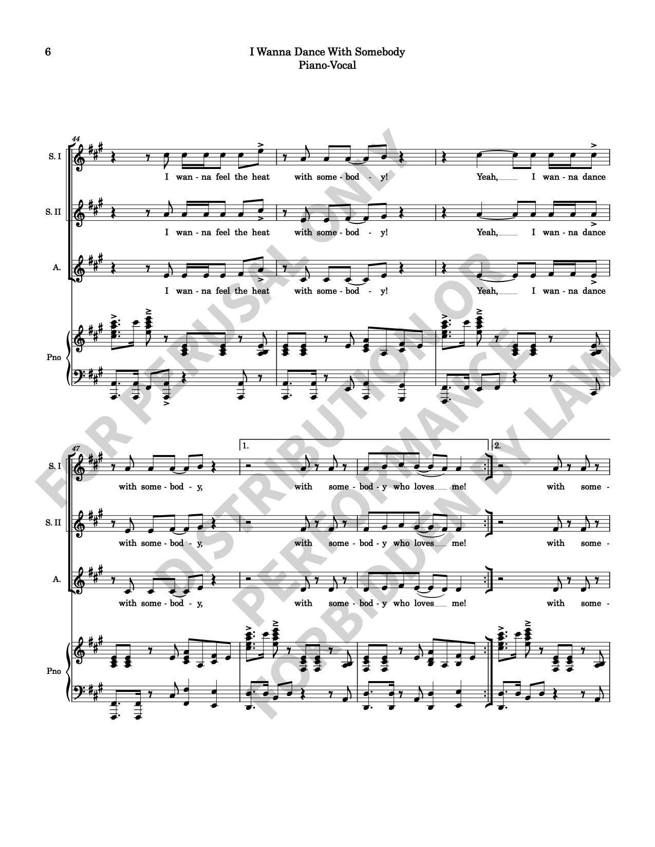 Whitney Houston's 1987 release of I Wanna Dance With Somebody earned her a Grammy award, and the chart-topper was logged as a whopping 6x platinum seller. Arranged here for SSA chorus, this unforgettable dance hit crackles with energy